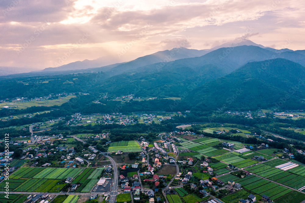 Aerial drone photo - The beautiful mountainous countryside of Japan. The many rice fields, mountains, and villages of Gunma Prefecture.