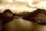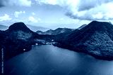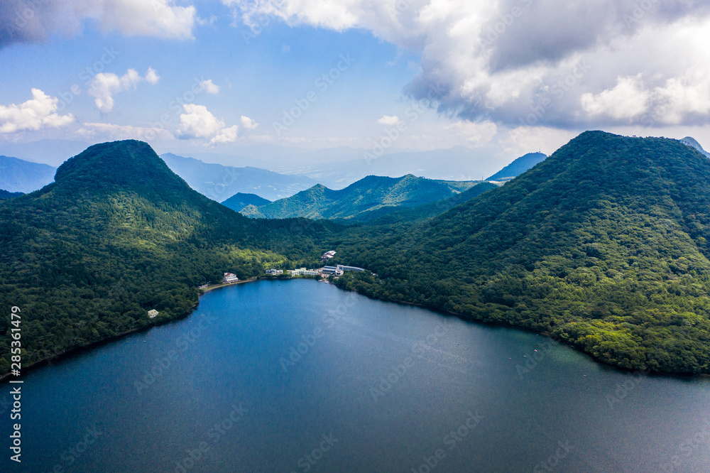 Aerial drone photo - Mt. Haruna rises above Lake Haruna. Gunma Prefecture, Japan.