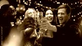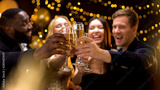 Happy multi-ethnic company clinking beverage glasses, celebrating New Year