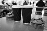 Two muffins and tall coffee cups on a table with blurred people in the background