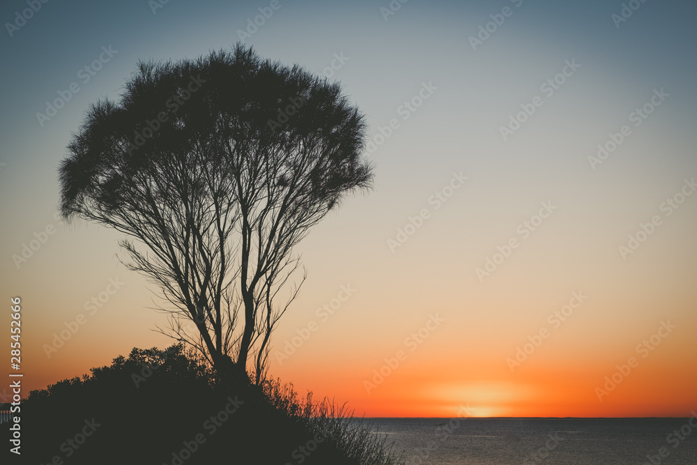 Sunset over ocean with coastline vegetation silhouette and copy space