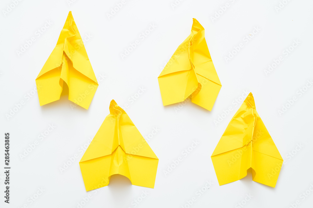 Persistence and motivation. Four yellow creased paper planes isolated on white background. Copy space.