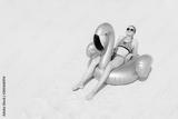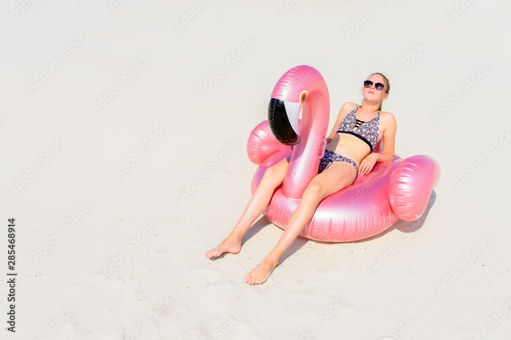 Young girl sunbathing on pink flamingo on a sandy seaside beach