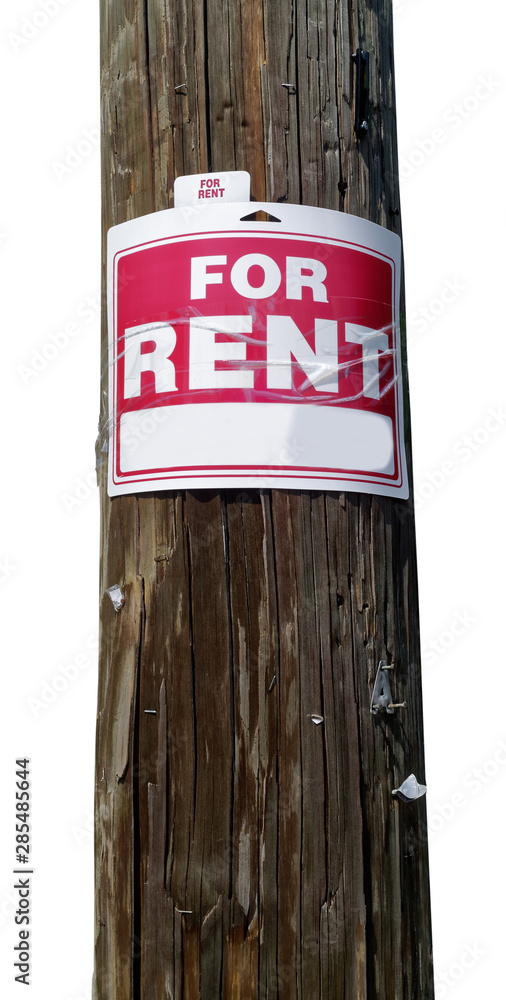 FOR RENT sign stapled to telephone pole. Isolated with some copy space on the sign for the creative.