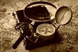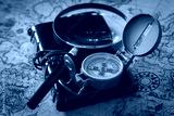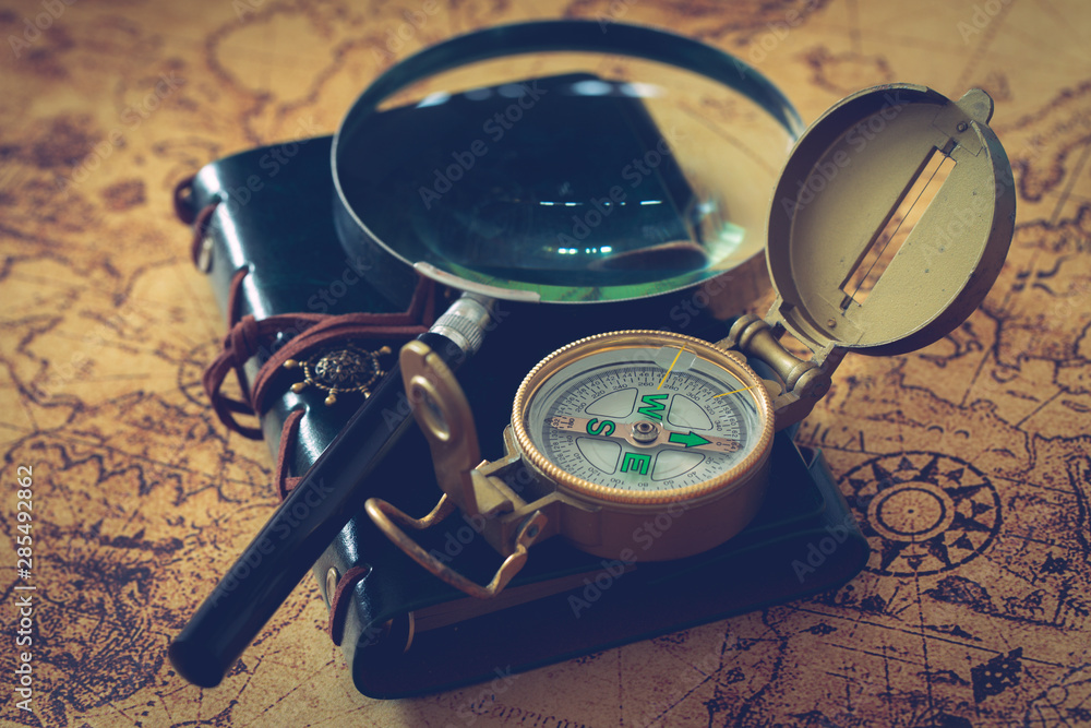 old map with compass, notebook and magnifying glass. The concept of searching for interesting places or treasures around the world.