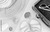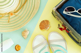 Holiday mood. Summer women's sun hat, sunglasses,shells...