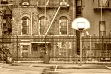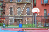 Empty basketball court on a rainy day. Surrounded by a fence and between homes. Harlem, NYC, USA.