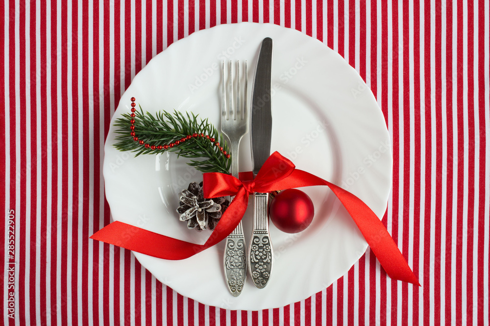 Christmas table setting on the white plate on the striped textile background. Top view. Copy space.