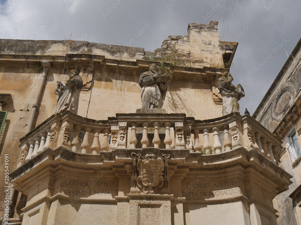 Lecce – Piazza Duomo propylaea. Propylaea in the entrance of Piazza Duomo are two opposite balconies in baroque style supporting the statues of st Oronzo, Irene and Venera and of the church's Father