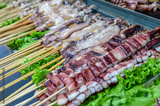 Close up of seafood sold outdoors in asia street market. Selective focus.