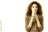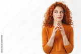 My evil plan is perfect. Hideous gorgeous redhead female scheming something, steeple fingers, squinting cunning and smirk, made-up good idea, thinking, pondering choices, stand white background