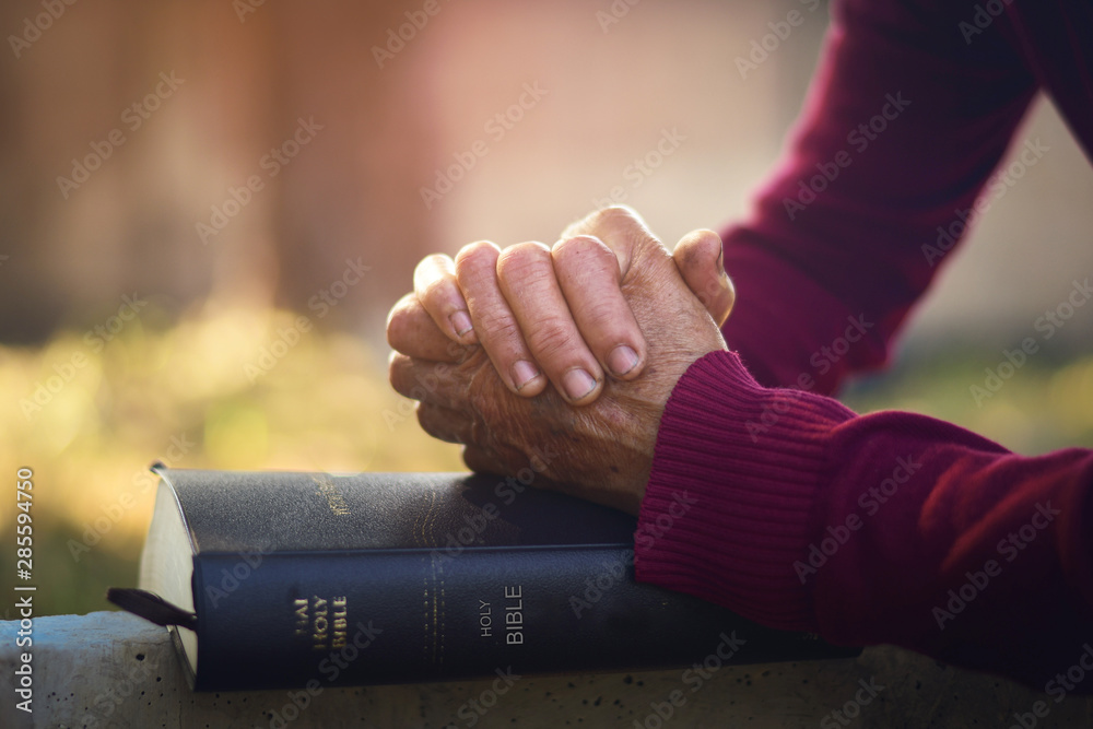 Hands folded in prayer on a Holy Bible Religion Concept