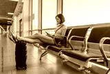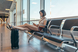 Female tourist sitting on bench with baggage in waiting room at airport.