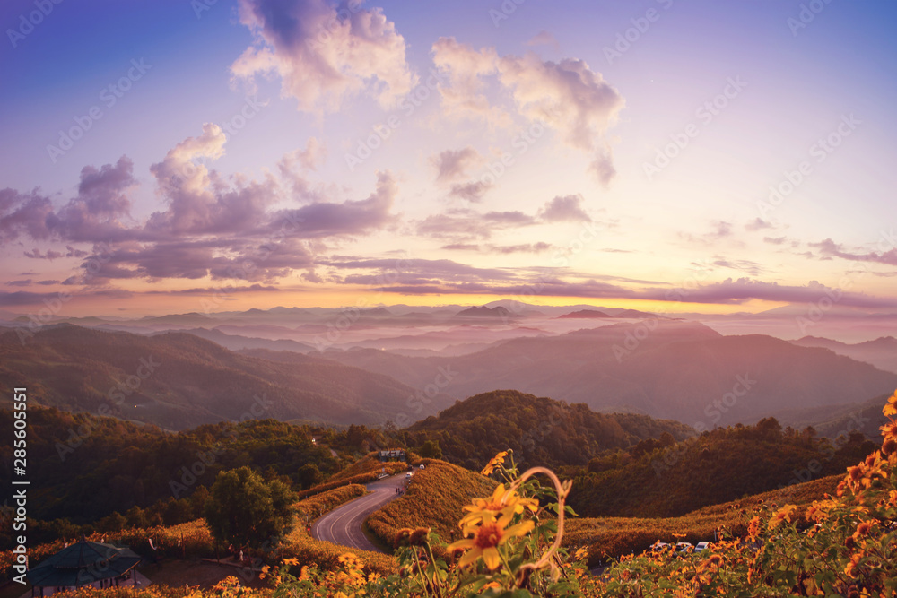 Tung Bua Tong Mexican sunflower field at sunset Mae Hong Son Province in Thailand.