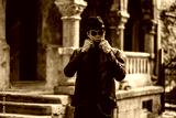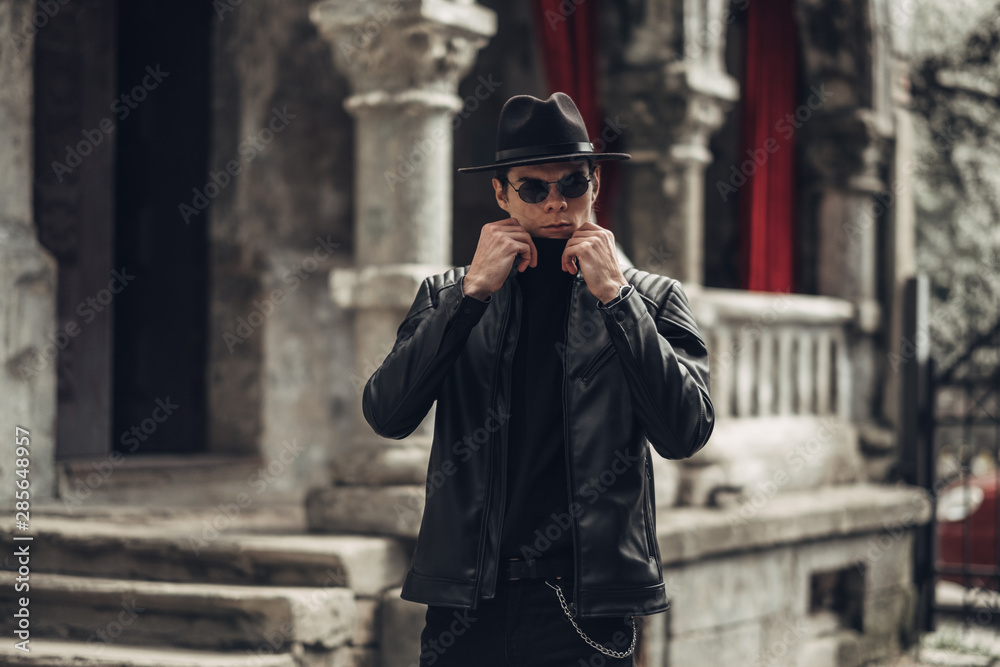 Portrait of Stylish Young Man in Black Leather Jacket and Hat