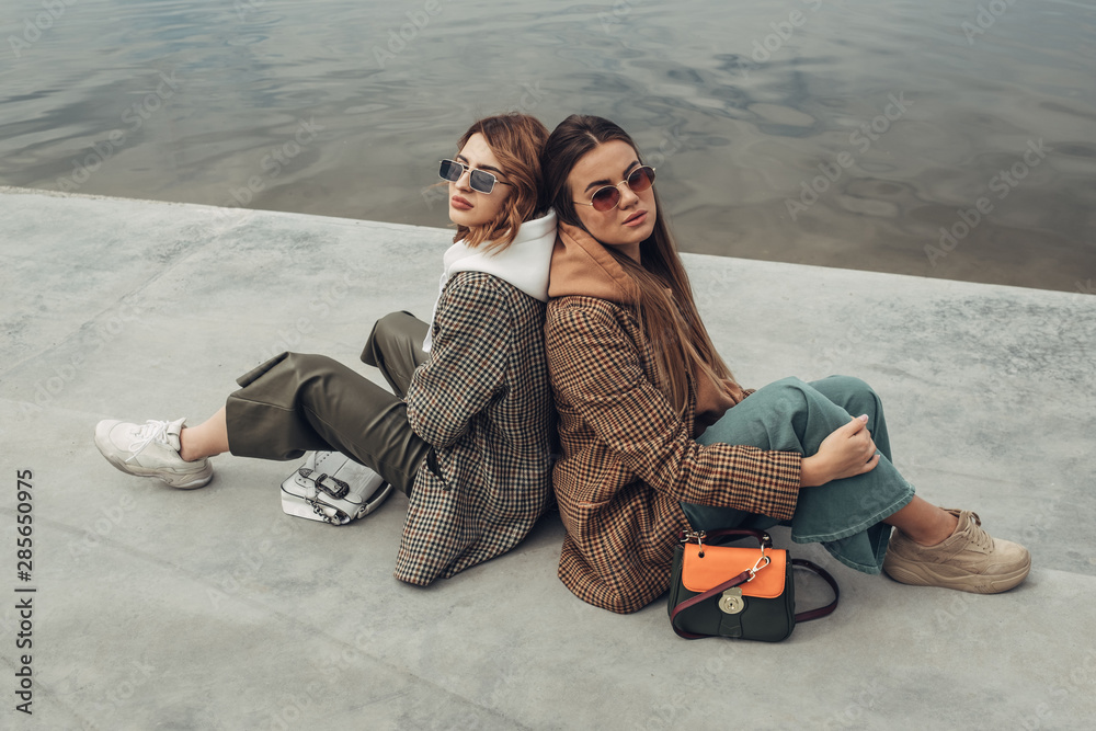 Portrait of Two Fashion Girls, Best Friends Outdoors, Wearing Stylish Jacket, Walking Near the Lake