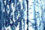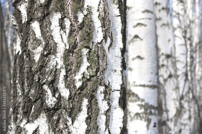 Young birches with black and white birch bark in spring in birch grove against the background of other birches