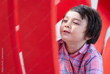 Portrait of happy little boy sitting on red chair, Adorable child playing with outdoor metal chair, Kid playing outside, Positive children concept