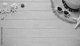 Flat lay composition with stylish beach accessories on light blue wooden background, space for text