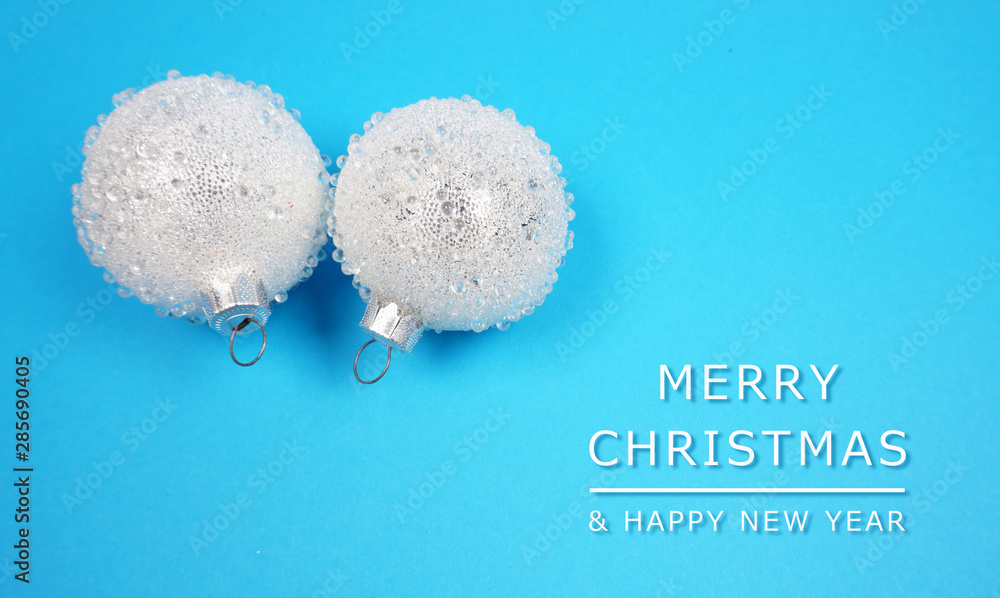 Snowy Christmas Balls with frozen snow, winter background, for christmas and new year, ice patterns frosted on ball at blue background with text