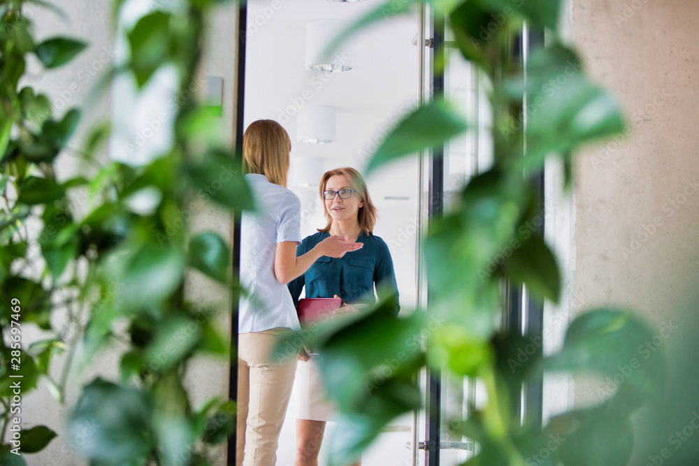 Business people standing while discussing over document against plants in office