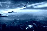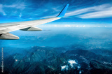 Wing of airplane flying above Alps. The plane's wing on blue sky and earth background. Flight over Alpine landscape. Aerial panoramic view of land and mountain from plane. Travel and vacation concept.