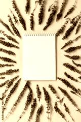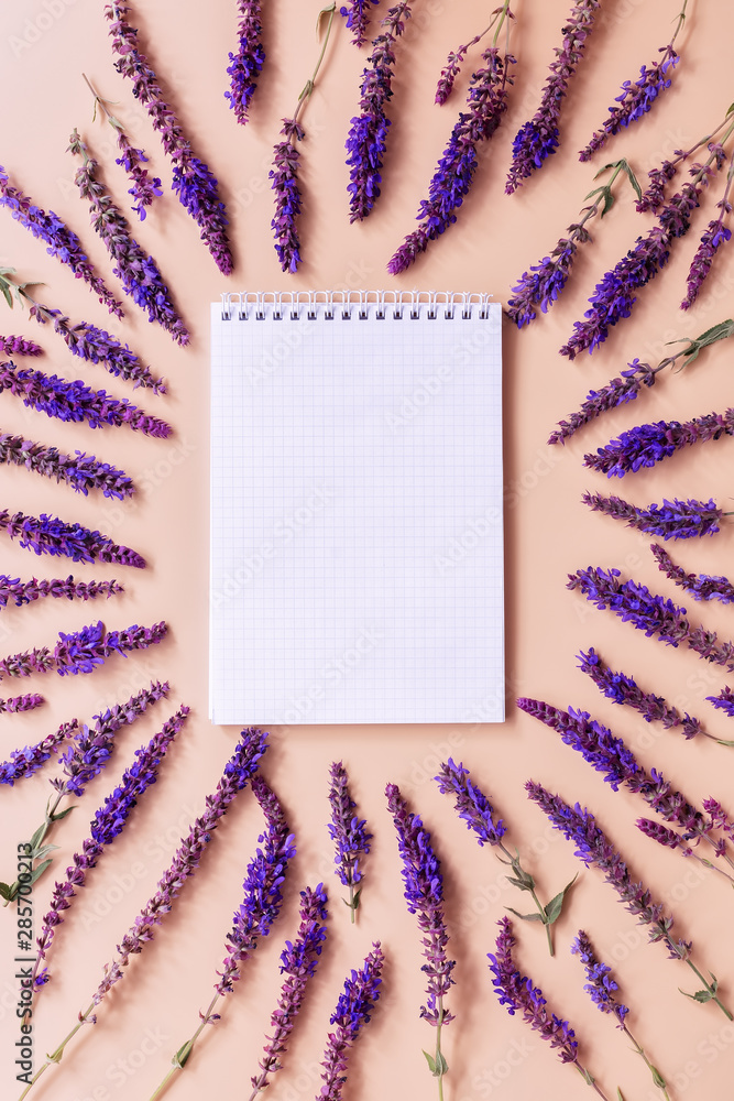 Blank notepad and frame of purple sage wildflowers on a pastel background. Top view, flat lay