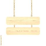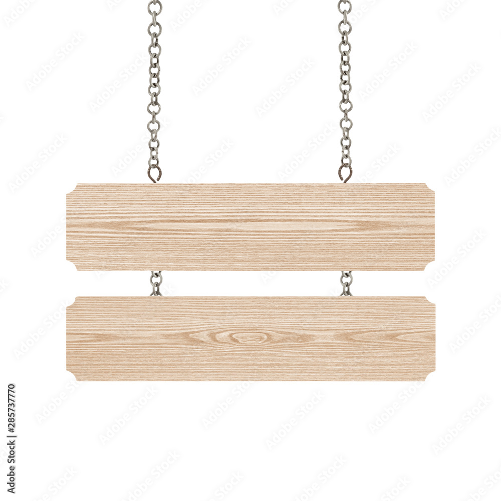 close up of a wooden sign with chain on white background with clipping path