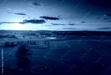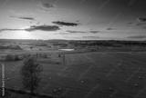 Sun just sets over a field of stubble with haystacks. August countryside landscape. Masuria, Poland...
