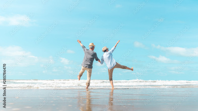 Charming elderly couple went to the beach to enjoy the sea breeze