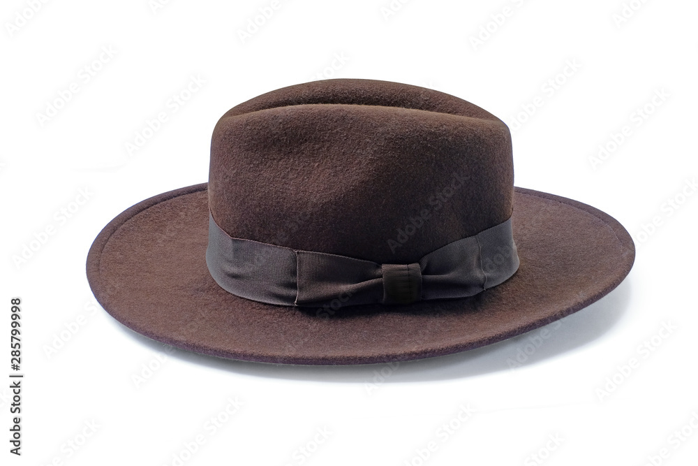 Vintage brown hat fasion with white ribbon isolated on white background. This has clipping path