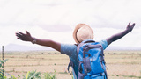 Freedom African tourist traveler man with backpack on view of mountain background.16:9 style