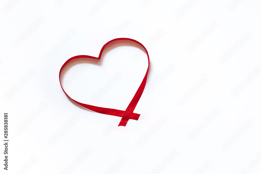 red satin ribbon on a white background in the shape of a heart, a symbol of love, valentine hand made, gift surprise packaging