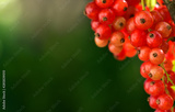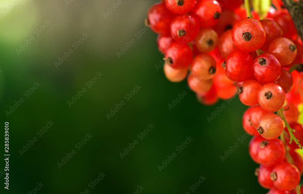 fresh redcurrants hang on shrub in the garden and glow in the sunlight
