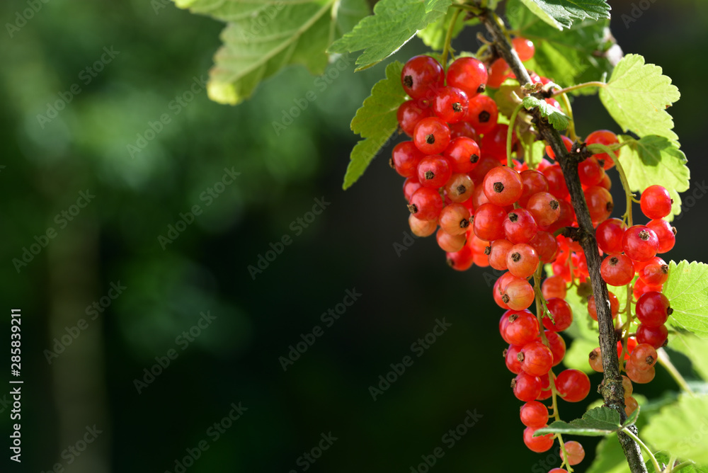 fresh redcurrants hang on shrub in the garden and glow in the sunlight