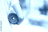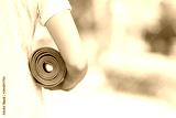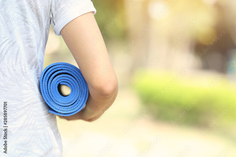 Young woman holding a yoga mat in exercise class for a sport and healthy concept