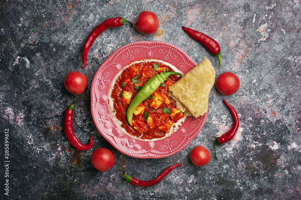 Paneer Makhani in pink plate decorated with tomatoes and chilli on dark background. Paneer Makhani is an indian cuisine curry with paneer cheese, tomatoes and spices.