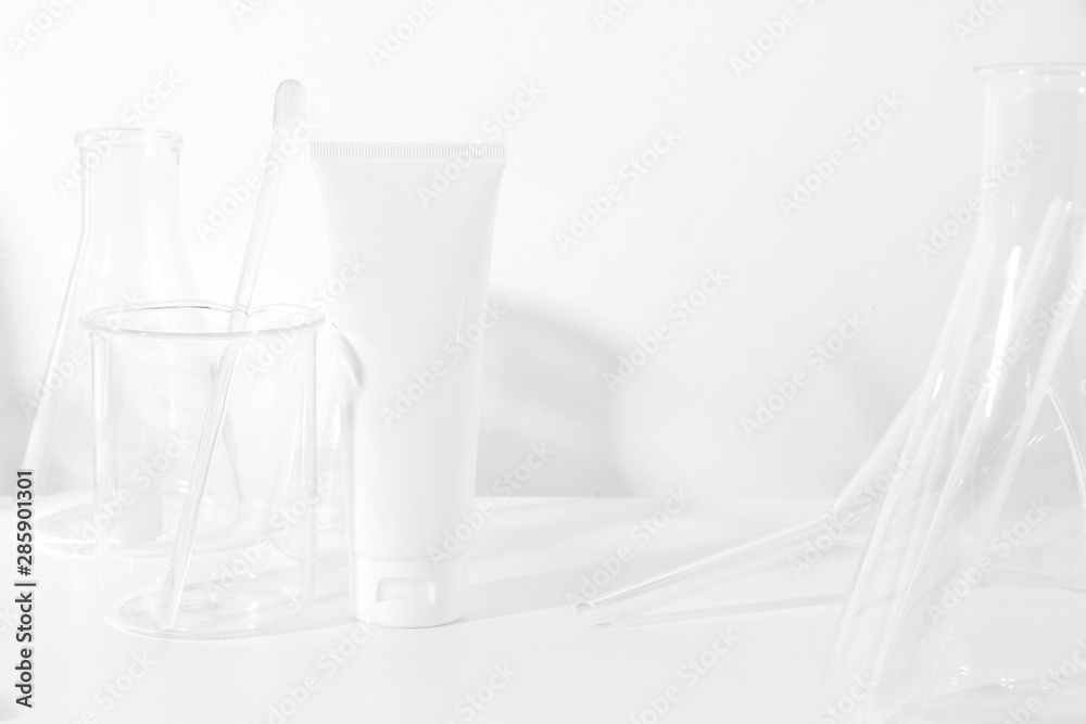 cosmetic mockup cream in bottle pakage with beauty spa treatment with science lab test tube