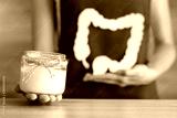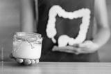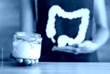 Female hand is holding jar with natural organic yogurt with bifidobacteria. Woman eat dairy products for her health. Nutrition that promotes good digestion and functioning of gastrointestinal tract.
