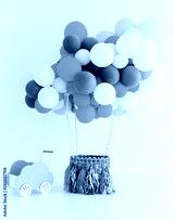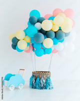 Festive balloons with basket on white background. Congratulations on the newborn.