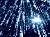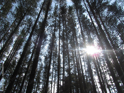 Trees in the forest. The sun shines through the trees. View from the bottom up. Morning in the pine forest.