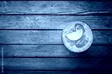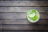 Refreshing mint cocktail mojito with rum and lime, cold drink or beverage with ice on dark wooden background, top view