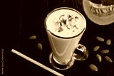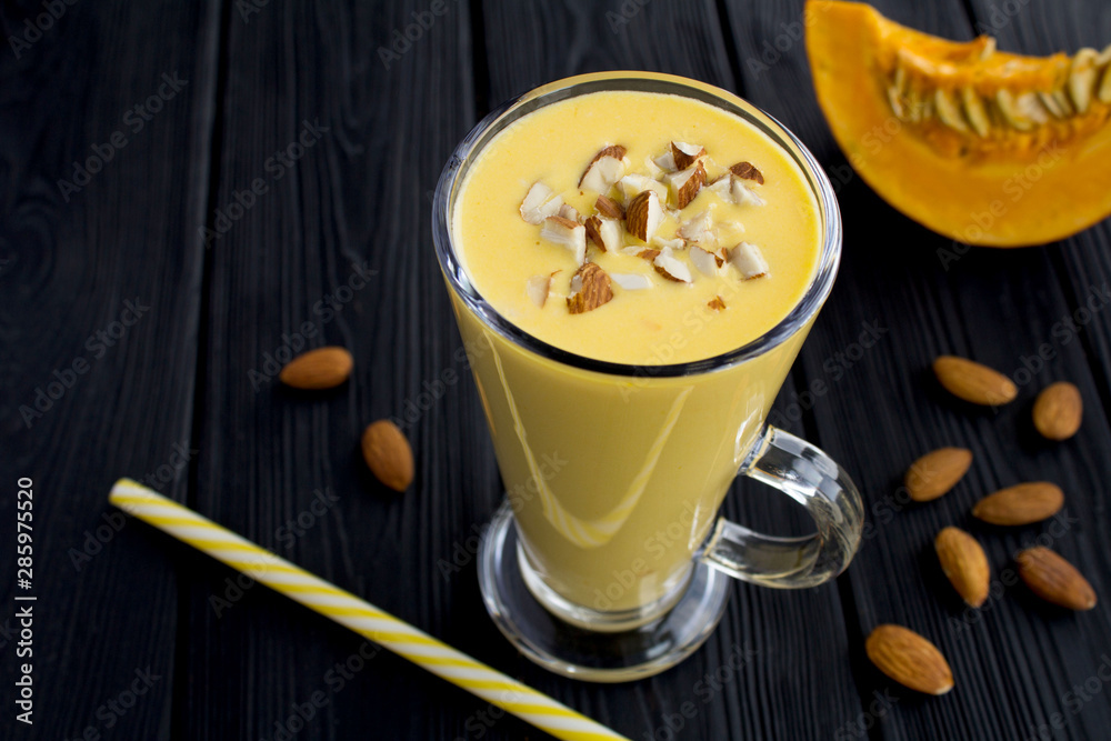 Yogurt smoothies with pumpkin and almonds on the black wooden background. Copy space.