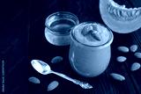 Puree with pumpkin, almonds and honey in the glass jar on the black wooden background. Copy space.