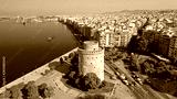 Aerial drone view of iconic historic landmark - old byzantine White Tower of Thessaloniki or Salonica, North Greece