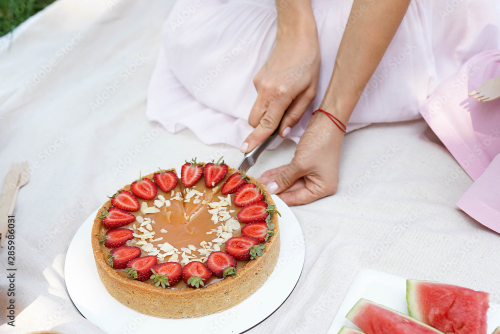 cake with strawberries on white background .girl cuts a dessert, homemade bakery, picnic food