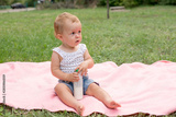 Baby holding bottle with milk or kefir, kid in the park on green grass. healthy food for children