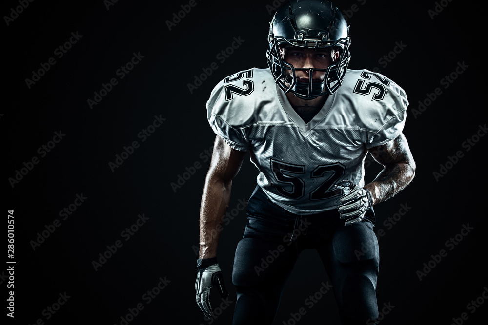 American football sportsman player in helmet on black background. Sport and motivation. Team sports.
