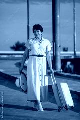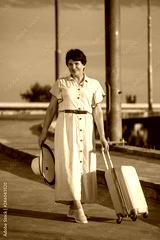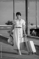 photo of the beautiful young woman with suitcase on the countryside road