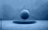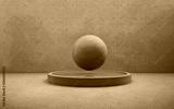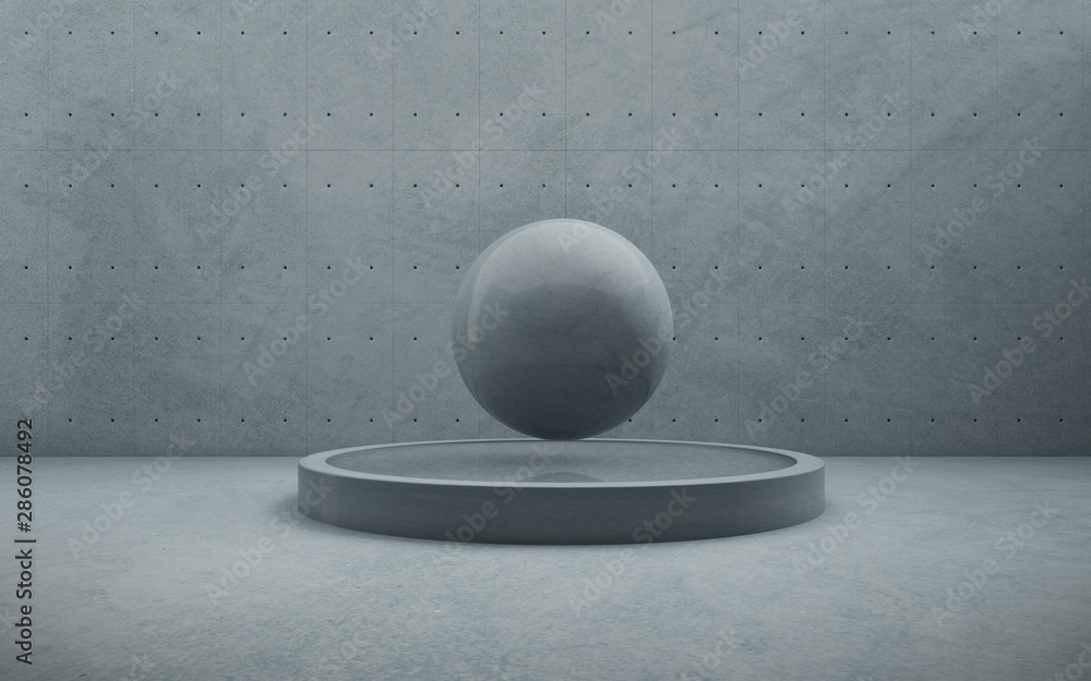Abstract of concrete museum space with sun light cast the shadow on the wall and circle pond,Sphere sculpture floating on the water, Perspective of brutalism architecture, 3d rendering